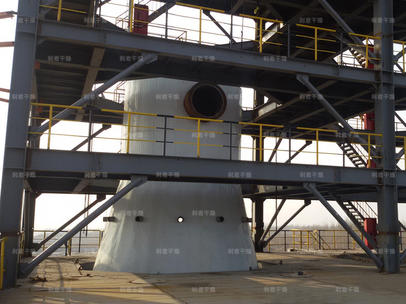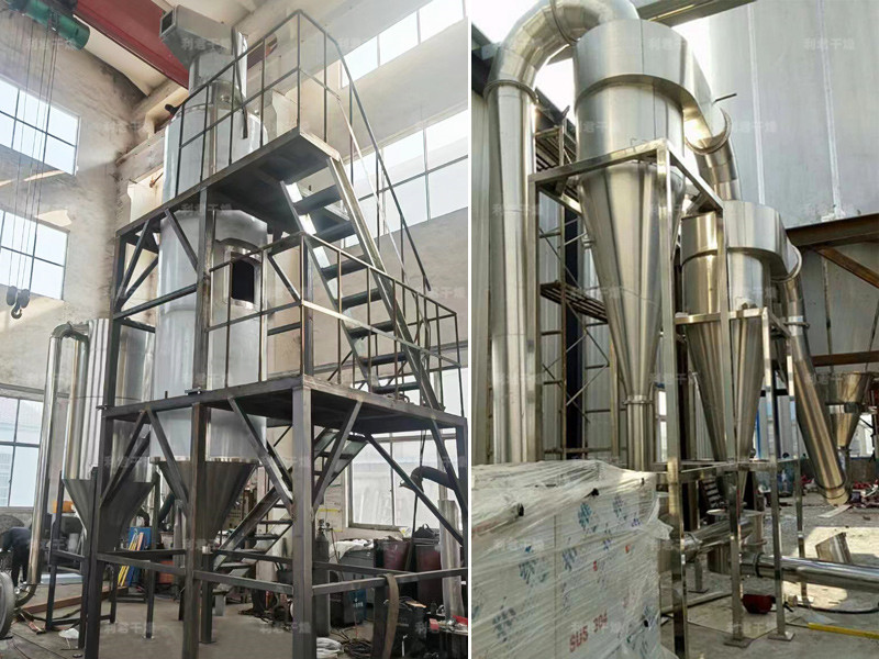 本機組工作過程為料液通過隔膜泵高壓輸入,噴出霧狀液滴,然后同熱空氣并流下降,大部分粉粒由塔底排料口收集,廢氣及其微小粉末經旋風分離器分離,廢氣由抽風機排出,粉末由設在旋風分離器下端的授粉筒收集,風機出口還可裝備二級除塵裝置,回收率在96-98%以上。